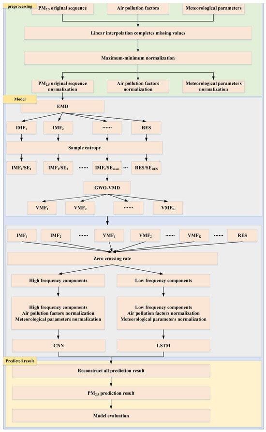 This study designed an innovative hybrid model, EMD-SE-GWO-VMD-ZCR-CNN-LSTM, for short-term PM2.5 forecasting. To improve prediction accuracy, the model incorporates various air pollution factors (PM10, SO2, NO2, CO, O3) and meteorological parameters (temperature, pressure, dew point temperature, rainfall, wind direction, wind speed) as input features. PM2.5 is the target variable for prediction, and the model is trained using these feature data. Specifically, the model combines the input air pollution factors and meteorological parameters with PM2.5 data, using these features to train the model so that it can learn the impact of these factors on PM2.5 concentration and thus improve prediction accuracy. PM10 is strongly correlated with PM2.5; SO2 and NO2 are precursors to PM2.5 formation, and CO and O3 influence the formation and variation of PM2.5. Meteorological parameters significantly affect the behavior of pollutants in the atmosphere, such as how rainfall helps to remove pollutants from the air and how wind speed and direction determine the dispersion and distribution of pollutants. By considering these factors comprehensively, the model is able to analyze and predict PM2.5 concentration changes more thoroughly. The model is mainly divided into three parts. The first part is data preprocessing, where missing data for air pollution factors and meteorological parameters are filled by linear interpolation, followed by min-max normalization, and the second part is the model design. Firstly, the PM2.5 sequence is broken down into several IMFs and RESs, and the SE values of all IMFs and RESs are computed. Secondly, optimizing the VMD hyperparameters with GWO and utilizing the resulting improved VMD, a second decomposition of the subsequence with the biggest SE value results in a series of VMF. Then, all the subsequences decomposed by PM2.5 are classified into high and low frequencies using ZCR, and the air pollution factors, meteorological parameters, and the high-frequency components are combined to form a high-frequency sequence. Air pollution factors, meteorological parameters, and low-frequency components are combined to form low-frequency sequences. The high-frequency sequence is predicted with CNN, and the low-frequency sequence is predicted with LSTM. The third part involves consolidating all predicted values to derive the ultimate forecast outcome and conducting model evaluation. Figure 3 illustrates the flowchart of the designed model.