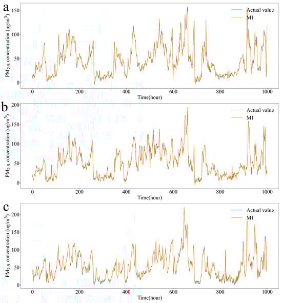 Figure S7 of the Supplementary Materials displays the evaluation criteria for the forecast outcomes of the M1 model across the three air quality monitoring stations, encompassing RMSE, MAE, MAPE, and R2. Detailed numerical values are provided in Table 2. From the results, the three air quality monitoring stations perform similarly in terms of RMSE and MAE, which have small values, indicating that the model’s prediction errors are relatively low. In terms of MAPE, the value of air quality monitoring station 1009A is slightly higher than the other two, probably due to the large fluctuation of data from this station. Overall, all three stations exhibit high R2 values, indicating that the model fits the actual observations well.