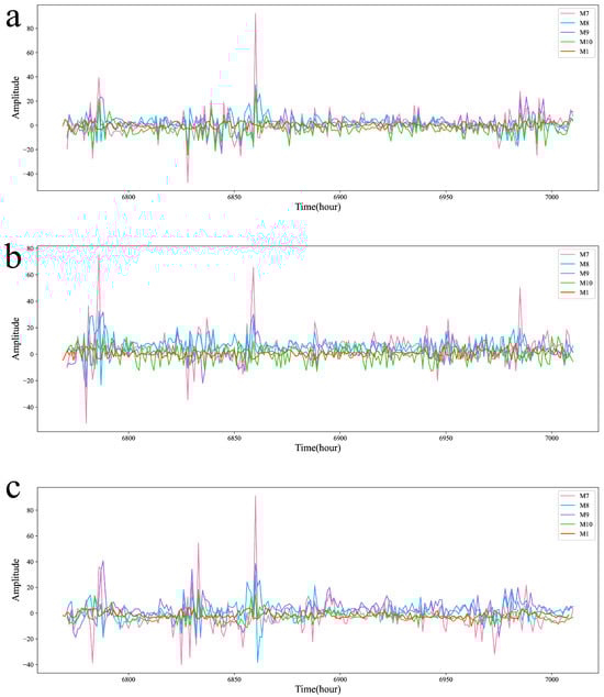 Further, as shown in Figure 6, large prediction error curves can be seen in the primary decomposition hybrid model for all of the three stations, with individual points having errors as high as 80. Although the M10 model exhibits a smaller prediction error compared to the primary decomposition hybrid model, its impact on error reduction remains unsatisfactory. The M1 model’s prediction error is centered at 0, with a small fluctuation, which demonstrates the small prediction error of the designed model of this study.