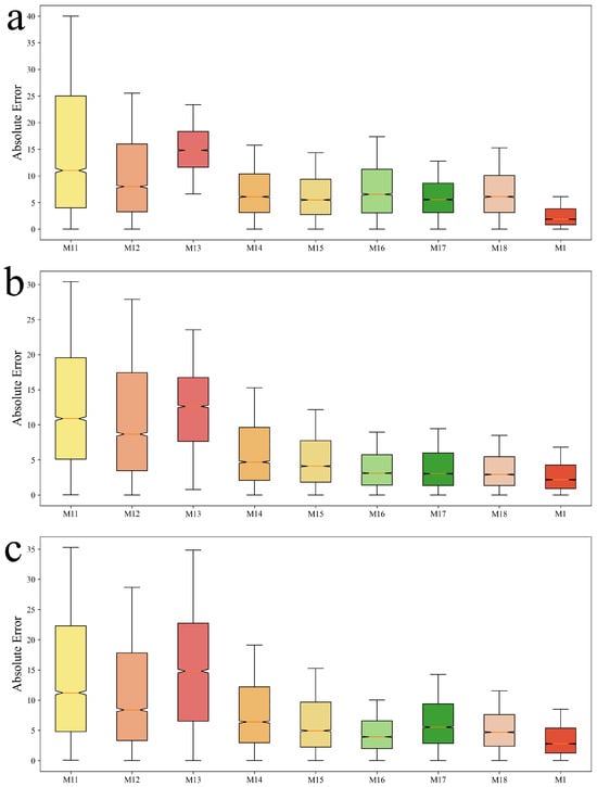 Comparison of box plots of absolute prediction errors of predicted and true values for the designed model (M1) and the hybrid model combining EMD-SE-GWO-VMD at stations: (a) 1009A; (b) 1010A; (c) 1011A.