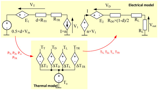 The formulated averaged electrothermal model of the half-bridge converter is presented in Figure 3 in the form of an equivalent circuit.
