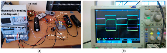 The view of the tested DC–DC converter is shown in Figure 4a, whereas the selected measured waveforms are shown in Figure 4b.