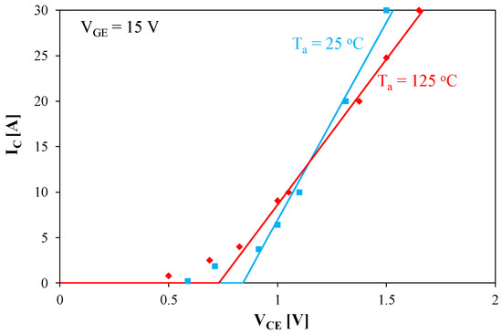 In order to determine the values of the model parameters, measurements of the DC characteristics of the diode and the IGBT were performed. Then, an approximation of these characteristics was performed using piecewise linear functions. The measured characteristics (points) and approximation results (lines) for the IGBT for two values of Ta temperature are shown in Figure 5.