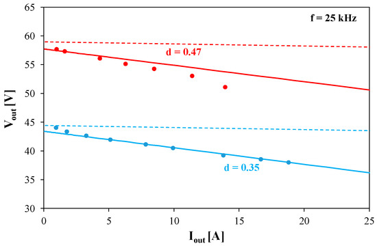 Measured (points) and computed (lines) output characteristics of the tested converter at selected values of the duty cycle.