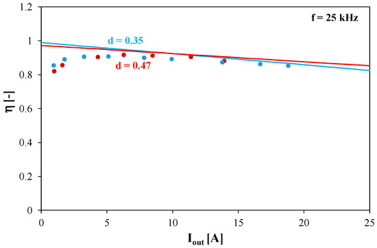 Figure 7 presents the dependence of energy efficiency η of the DC–DC converter on the load current for the selected values of the duty cycle.