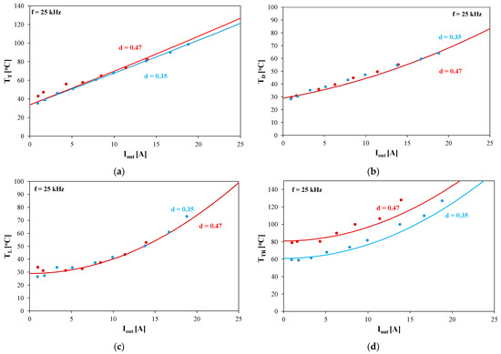 As it is visible, the temperature inside each of the converter components is an increasing function of current Iout. In the case of the transistor (Figure 8a), an increase in the duty cycle value causes an increase in temperature TT, whereas for the diode (Figure 8b), an opposite trend is observed. On the other hand, there is practically no influence of the d value on the inductor temperature (Figure 8c) because it depends only on the current Iout value and the inductor winding resistance, which does not depend on the current value. The transformer temperature increases with an increase in the duty cycle value (Figure 8d) due to an increase in the core losses caused by an increase in the magnetic flux density amplitude at a higher voltage value on the transformer winding [35].