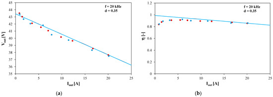 Figure 9 shows the computed and measured dependences of the output voltage (Figure 9a) and energy efficiency (Figure 9b) of the tested DC–DC converter on the load current.