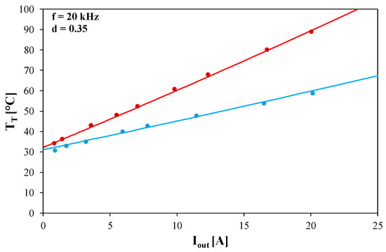 As can be seen in Figure 6, Figure 7 and Figure 8, good agreement was achieved between the results of the computations and measurements for all of the considered characteristics for the cases when both the transistors were placed in a common IGBT module. In order to illustrate the influence of mutual thermal couplings between these transistors, Figure 9 and Figure 10 show the computed and measured characteristics of the considered converter obtained at the control signal frequency f = 20 kHz and the duty cycle of this signal d = 0.35. In these figures, the results obtained for the transistors placed in one IGBT module are marked in red, while the results obtained for the transistors placed in separate modules are marked in blue. In the computations concerning the transistors placed in separate IGBT modules, a value of mutual thermal resistance Rthm = 0 was assumed.