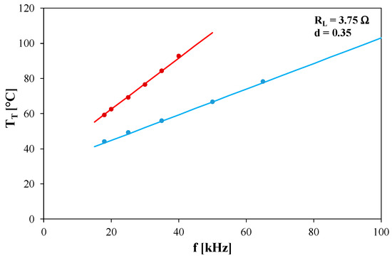 An influence of the switching frequency on the characteristics of the considered converter was also analyzed. Figure 11 presents the computed and measured dependence of the junction temperature of the transistors placed in one module (red) or in two modules (blue) on frequency f. The tests were carried out at d = 0.35 and load resistance RL = 3.75 Ω.