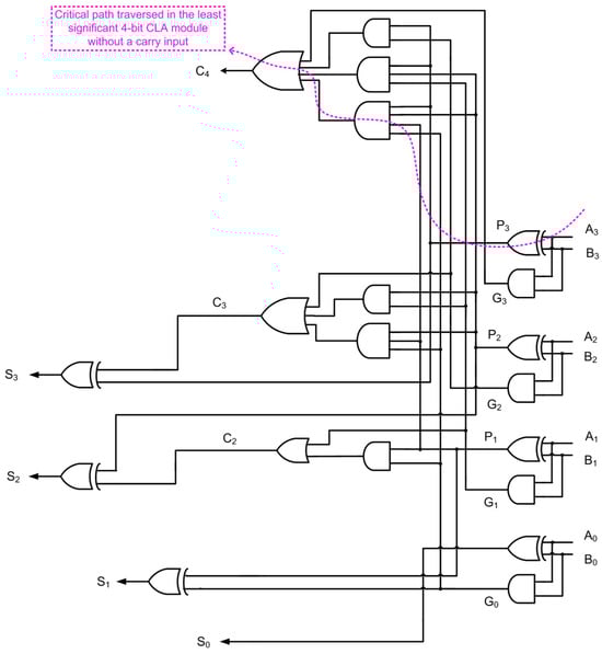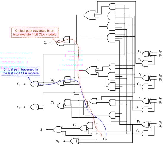 A N-bit CLA is typically composed of a cascade of M-bit CLA modules, where both N and M are even numbers, and N is an exact multiple of M. The carry output from one CLA module is passed as the carry input to the next CLA module in the cascade. For instance, a 32-bit CLA can be constructed using sixteen 2-bit CLA modules, eight 4-bit CLA modules, or four 8-bit CLA modules connected in a cascade, as shown in Figure 3. Although it is possible to realize a 32-bit CLA using two 16-bit CLA modules, it is advisable not to use large basic CLA modules. This is because, as Equations (3)–(6) or (7)–(10) indicate, the number and size of the product terms comprising a look-ahead carry output increase linearly with the module size. This would lead to an increase in the number of logic gates and logic levels, leading to a high critical path delay. Therefore, large-sized CLA modules are not recommended for constructing N-bit CLAs. In Figure 3a–c, the least significant CLA module does not have a carry input, while the other modules have a carry input. For example, the least significant 4-bit CLA module in Figure 3b is represented by Figure 1, and the 4-bit CLA modules with carry input used in Figure 3b are represented by Figure 2. Correlating Figure 3b with Figure 1 and Figure 2, the theoretical critical path of the 32-bit CCLA comprising 4-bit CLA modules can be understood as follows: the critical path of the least significant 4-bit CLA module without a carry input would be as highlighted by the pink dotted line in Figure 1, the critical path of more significant but intermediate 4-bit CLA modules would be as marked by the red dotted line in Figure 2, and the critical path of the most significant 4-bit CLA module would be as indicated by the blue dotted line in Figure 2.