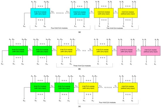 - Moderate-size CLA modules are used in the least significant bit positions, while bigger-size CLA modules are used in the more significant bit positions (as seen in Figure 4a,c).