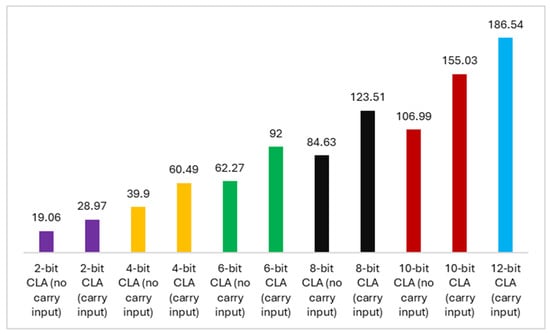 Area (in µm2) of different CLA modules without and with the carry input. The areas of 2-, 4-, 6-, 8-, 10-, and 12-bit CLA modules are portrayed by purple, yellow, green, black, dark red, and light blue bars respectively.