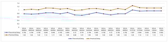 - NCLA-1244444, NCLA-128444, and NCLA-12884 have the same theoretical delay, which agrees with the corresponding practical delay estimates given in Table 1.