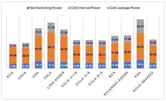 The total power dissipation is composed of dynamic and leakage power, and the dynamic power is composed of cell internal power and net switching power components. The split-up of total power dissipation of different adders is shown in Figure 8. As noticed in Figure 8, CSLA dissipates greater dynamic power than other adders possibly due to the duplication of the adder logic within the CSLA. KSA suffers from greater leakage (static) power compared to other adders, and this is due to its increased area occupancy in comparison with other adders.