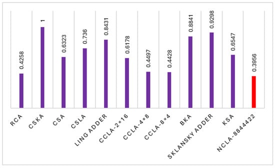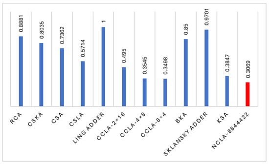 In some literature, for example [], the area-delay product (ADP) has been additionally considered as a figure of merit besides the PDP. The ADP helps to quantify the trade-off between area and delay. Increasing the area might reduce the delay and thus increase the speed, which is found to be true for KSA while reducing the area could increase the delay, which is found to be true for RCA. So, the ADP is a measure of how efficiently a design uses its area to achieve a certain level of performance. Lower ADP values generally indicate more efficient designs, which indicates minimizing the area while keeping the delay low. A design with a lower ADP is preferable as it suggests a better balance between area and delay. Given this, the ADP of all the 32-bit adders in Table 2 were calculated and normalized. The actual ADP of each adder was divided by the highest ADP of a specific adder (here, CSKA) to do the normalization. The normalized ADP of various 32-bit adders is depicted in Figure 10, and the preferred value, i.e., the least normalized ADP value is highlighted by the red bar corresponding to NCLA-8844422. Compared to RCA, which has the least ADP among existing adders, NCLA-8844422 achieves a 7% reduction.