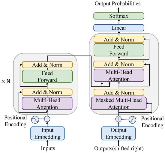 The Transformer model abandons the traditional recurrent structure and adopts a self-attention mechanism to process sequence data in parallel. The structure is illustrated in Figure 1. In the self-attention layer, each token is multiplied by three trainable weight matrices, , , and , to obtain three vectors of the same length, Q, K, and V, respectively. Then, the similarity scores of Q and K are computed and interacted with V to obtain the vector representation of each token. The specific calculation process is as follows: