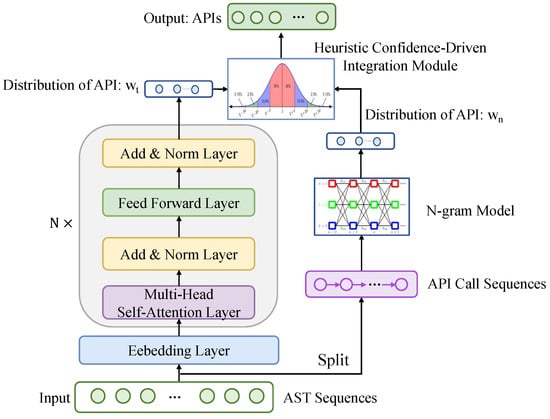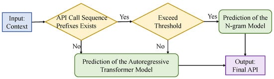 - Heuristic confidence-driven combinatorial strategy module: Confidence levels are set using a heuristic method. When the confidence level of a predicted API exceeds a certain threshold, predictions are made using the n-gram model. Conversely, if the confidence level of a predicted API falls below the threshold, predictions are made using the autoregressive Transformer decoder model.