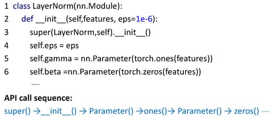 Firstly, we extract all relevant API call sequences from the project’s code repository on a per-Python file basis. In this paper, following established practices [23], we convert the source code into an abstract syntax tree (AST), identify the API nodes within it, and then retain only the API call nodes and control nodes (such as keywords like ‘for’, ‘if’, ‘return’, etc.) from the token sequence of the source code. This process results in a complete API call sequence for each file, as shown in Figure 5: