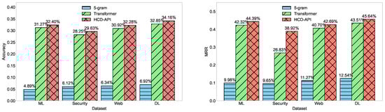 The accuracy (left) and MRR (right) of the 5-gram, Transformer, and DLH-API models.