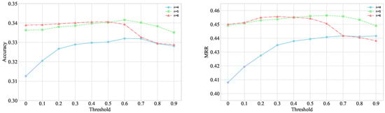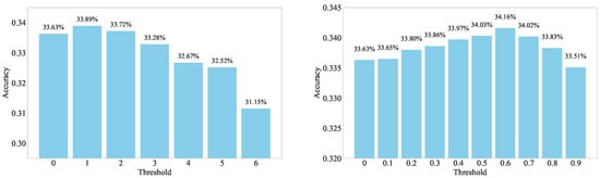 Figure 8 shows that when using absolute frequency, the highest accuracy, at , occurred when the threshold was set to 1. With relative frequency, the highest accuracy peaked at when the threshold was , which is higher than the accuracy under the absolute frequency. Additionally, both absolute and relative frequencies exhibited a trend of increasing and then decreasing accuracy. Similar observations were made in the experiments conducted on the other three datasets.