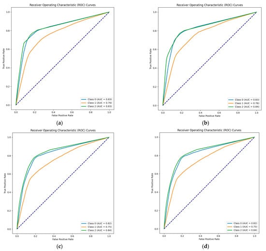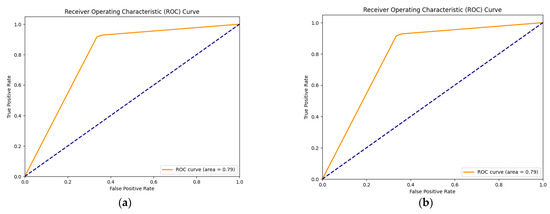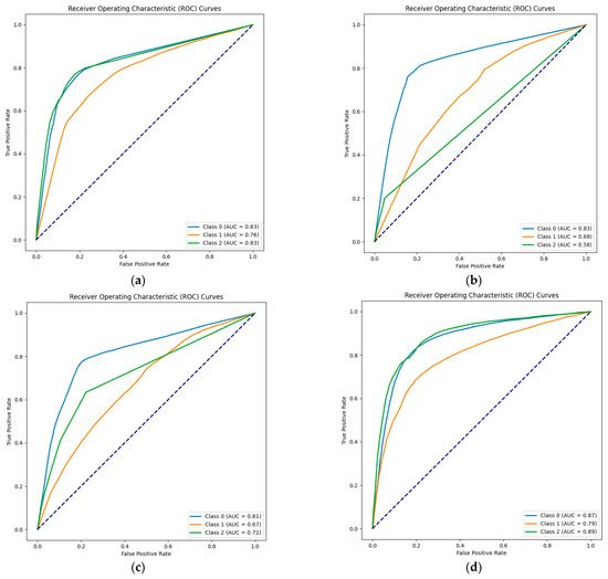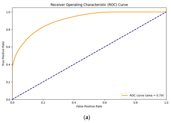 - ROC/AUC (receiver operating characteristic curve/area under the curve): The ROC curve is a graphical representation commonly used in binary classification models to assess their performance. In the ROC curve, the true positive rate (sensitivity) is plotted against the false positive rate (1—specificity) at various threshold settings for the model. The diagonal line in the curve represents the ROC curve for a random classifier. The AUC is the measure of the area under this curve. A higher AUC value indicates the model has a better ability to distinguish between the positive and negative classes. The AUC ranges from 0 to 1, where 0.5 represents a model that performs no better than random chance, and 1 indicates a perfect model.