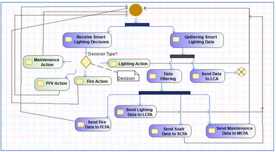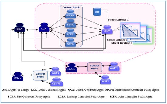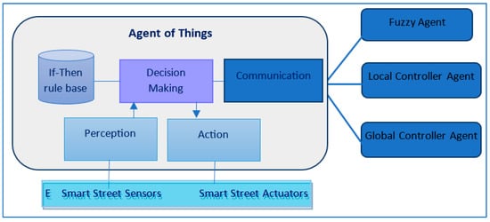 In this section, we propose a generic multi-agent architecture that can be adapted and accomplished in various ways to meet different constraints, including user perspectives, environmental and economic constraints, power requirements, and desired quality. An overview of the architecture is provided in Figure 3. It is important to note that “Thing” refers to interconnected devices, mainly smart lampposts with sensors, actuators, and communication modules. It also includes related electrical infrastructure like control cabinets and traffic-management devices, depending on the implementation.