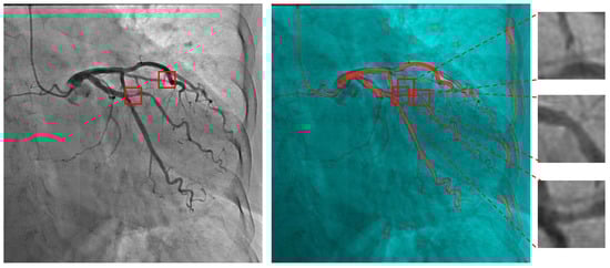 Coronary artery disease (CAD) is a cardiovascular condition characterized by the narrowing and hardening of arteries, which impedes blood flow to the heart []. CAD is a prevalent global health concern, with its incidence rising at an alarming rate. This disease not only increases mortality and morbidity but also significantly diminishes patients’ quality of life and imposes a substantial burden on healthcare systems worldwide []. Coronary angiography has traditionally been regarded as the ‘gold standard’ for diagnosing coronary artery disease (CAD). Invasive coronary angiography (ICA) plays a vital role in identifying arterial stenosis and is extensively employed in clinical settings. The procedure involves the injection of a radiopaque contrast agent into the coronary arteries, followed by visualization using a sequence of X-ray images []. Clinically, the severity of CAD is often assessed by measuring the percentage of stenosis, a process largely dependent on the physician’s visual evaluation. Typically, a stenosis of 50% is the threshold for contemplating coronary revascularization, whereas a stenosis of 70% indicates significant clinical lesions []. However, this technique has limitations. The diagnosis relies on the personal experience and judgment of radiologists, and this subjectivity may lead to low reproducibility of diagnostic results. Differences in fatigue and experience levels among physicians can also result in incorrect diagnoses. Additionally, the quality of traditional angiographic images may be affected by factors such as radiation dose limitations, poor imaging angles, and uneven distribution of contrast agents, leading to low contrast and image blurring. These issues make accurate manual assessment of coronary artery stenosis more complex []. Moreover, the anatomical structure of coronary arteries varies significantly among individuals. This anatomical variability, combined with the complex three-dimensional structure of the coronary network, makes accurate interpretation of angiographic images challenging. The dynamic nature of blood flow and its interaction with the coronary artery walls add further complexity. Variations in blood flow velocity and pressure during the cardiac cycle can cause changes in the appearance of stenosis in angiographic images. This temporal variation requires real-time assessment and advanced imaging techniques to capture the true extent of arterial stenosis. Given these limitations, there is a critical need for advanced diagnostic methods that can overcome these challenges.