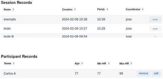 While the software is running, the system can be accessed through a web interface using a notebook computer or tablet browser. Starting by describing the system user’s perspective, after logging in, users will have the options corresponding to their profile, which can be administrator or session coordinator. It is important to clarify the difference between a system user and a training session participant. Only the first has an account to perform actions in the system, or to perform analyses or consult records. The second concept corresponds to each person participating in the training session, and who, with consent, is being monitored by the system through data collected from wearable sensors.