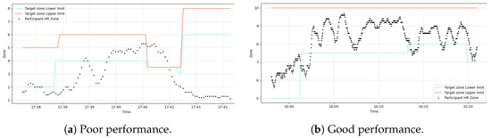 Visual data representations: two participant HR zones. In (a), there is little alignment with the training goal, whereas in (b) the participant stayed predominantly within the target zone.