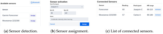 To create a new session, the coordinator defines the session name. Some fields, such as the session coordinator and the date, are automatically filled in. Afterward, it is necessary to assign sensors to participants as illustrated in Figure 3. On the left (Figure 3a), we can see how the system lists the names of the available HR sensors, meaning that they have been automatically detected and have not yet been assigned to anyone. Each sensor is associated to one participant who has not yet been selected as shown in the middle image (Figure 3b). The resting and maximum HR values for that participant are pre-filled with default values from the participant’s record but can be adjusted at this point and for this session’s scope. Once all participants are registered, a confirmation grid displays all sensor/participant pairs, including a preview of each sensor’s data as shown in the second column of Figure 3c.