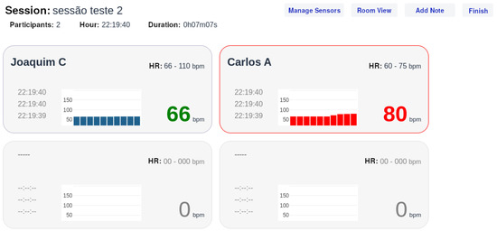 The coordinator can now start the session, at which point the system enters the exercise monitoring mode and begins collecting and storing data from the sensors. At this stage, the system displays a monitoring dashboard, showing real-time HR data from each participant, along with a bar graph representing the HR trends over the last 30 s as depicted in Figure 4. This allows the coordinator to have an accurate and easy readable perception of the training intensity for each person in the group. When certain customized and rule-defined circumstances occur, alerts are shown to immediately notify the coordinator, or the group if they are watching the panel. Alerts are visual, with changes that stand out from the regular panel, and can optionally include audible beeps. The typical alert criteria are if the observed level of effort is too high, or when it diverges from the target training intensity. At the top right of Figure 4, we see an example of an alert indicating intensity above the limit for participant Carlos.