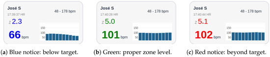 In this operation mode, the monitoring dashboard will also display an indicator for the participant’s HR zone, calculated based on their specific parameters. This zone indicator allows us to compare the effort level between participants. Figure 6 shows the monitoring panel including the HR zone (to the left, above the HR) across three scenarios: (a) the participant’s effort is below the target intensity; (b) the participant’s zone is within the intended range; (c) the HR zone exceeds the intended range.