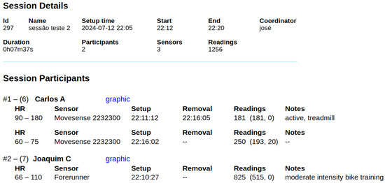 At the end of the physical activity, the session is marked as closed. The system records the end time and stops storing the data streams coming from the sensors. After that, participants may remove the sensors. The coordinator will see a session summary page that includes the session duration, the coordinator’s name, the participants involved, and which sensors were used as illustrated in Figure 7.