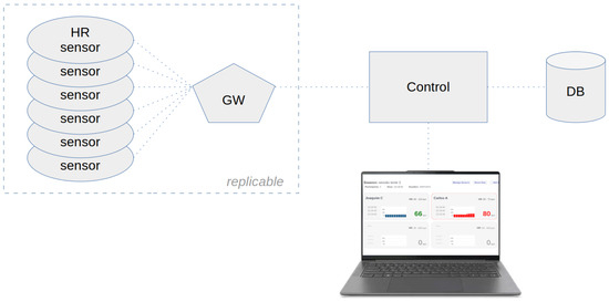 The sessions’ exercise can take place in a gym room, on a sports court, or, in a healthcare context, at a physical rehabilitation facility. Since participants are spread across the space and can even move to a corridor, or switch between equipment, for instance, between a treadmill and an exercise bike, we designed an IoT-based data collection solution. Figure 8 shows the general architecture of the developed system, from sensors to visualization components. A sensor gateway module (GW) is deployed to collect data from nearby sources and stream them upwards to the control module, the system’s central node responsible for processing, analysis and storage management. In terms of platform, for the gateway component, to which the sensors are paired, we use a mini-PC equipped with a Bluetooth controller version 5.3, and a network interface (wired or wireless) to upstream data to the control module. Currently, both the gateway and control modules run the Ubuntu Linux operating system and use Java (JRE 17+) to execute the system software. We use BlueZ (https://www.bluez.org/about, accessed on 6 June 2024) to interact with the Bluetooth controller on Linux, and the blessed-bluez (https://github.com/weliem/blessed-bluez, accessed on 6 June 2024) library for operations and communication with the sensors.