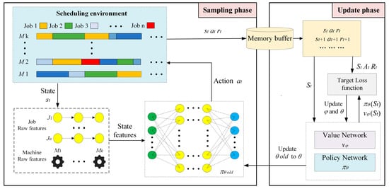 - We model the FJSSP as a single-agent reinforcement learning (RL) problem, where the scheduling agent must select the jobs to process and assign them to the corresponding machines at each step. During the training phase, we employ the Proximal Policy Optimization (PPO) algorithm based on an actor-critic architecture to train the scheduling agent in order to learn effective scheduling strategies.