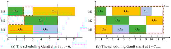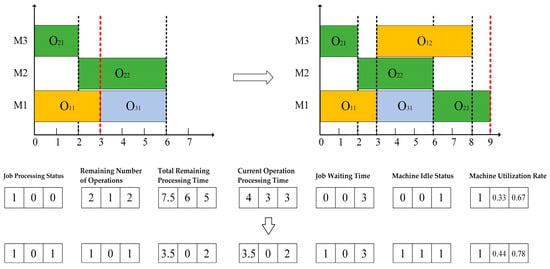 To provide a more intuitive representation of the state, Figure 2 presents the state transition process from time t = 3 to t = 9 based on the 3 × 3 FJSSP instance in Table 2.