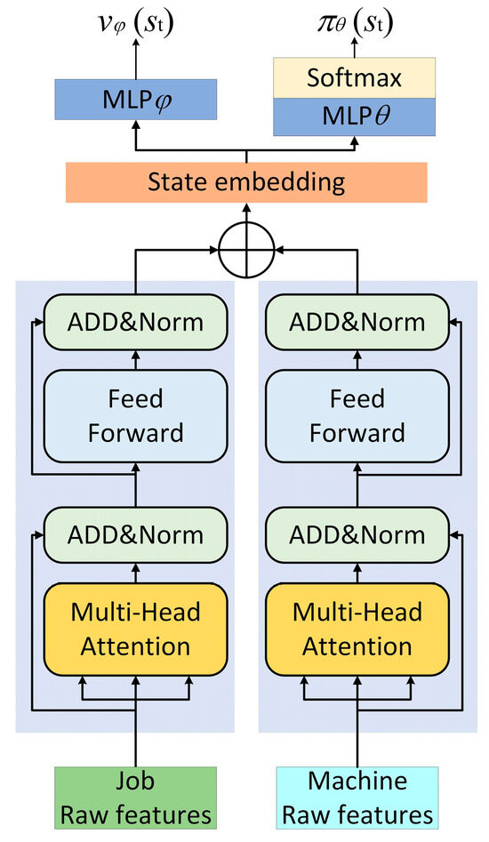 For the FJSSP, Luo [35] employed a DQN algorithm to extract seven general features with a range of [0, 1] to represent the state at each rescheduling point and designed six optional composite rules as actions to determine the next operation to process and the machine to assign. Lei et al. [36] transformed the FJSSP into a multi-agent MDP, proposing a Multi-Pointer Graph Network (MPGN) architecture based on GIN in particular, along with a training algorithm called multi-PPO to learn two sub-policies, including a job operation action policy and a machine action policy to assign a job operation to a machine. Song et al. [37] represented the shop scheduling state based on heterogeneous graphs and introduced an architecture based on a heterogeneous graph attention network (GAT) to capture the complex relationships between operations and machines. They combined operation selection and machine assignment into a composite decision, which required fewer edges compared to disjunctive graph representations and simplified the action space. Wang et al. [38] addressed the complex relationships between operations and machines by proposing a dual attention network (DAN) composed of multiple interconnected operation and machine message attention blocks. The DAN drew upon these intricate relationships to construct production-adaptive operation and machine features, demonstrating strong generalization ability on large-scale FJSSP problems. Ho et al. [39], also based on GNN, proposed a new method for solving JSSP and FJSSP problems. This method can effectively simplify the state information, reduce the computational complexity, and accelerate the training process by removing the completed machines and jobs from the scheduling process. Echeverria et al. [40] introduced two new methods based on heterogeneous GNN to enhance the performance of DRL scheduling algorithms: the first involves generating a set of multiple scheduling strategies, while the second combines DRL with dispatching rules that constrain the action space. Yuan et al. [41] opted not to use the computationally expensive GNN but instead proposed a lightweight Multi-Layer Perceptron (MLP) as the state embedding network, and this helped reduce the algorithm’s computational complexity to a certain extent.