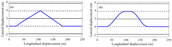 (a) The path of the constant velocity offset model (Figure 8a) is a straight line, with lateral velocity remaining constant during the lane change. This model offers high computational efficiency and simplicity in path planning, but due to zero lateral acceleration, the curvature of the path at the start and end of the lane change exhibits abrupt changes, resulting in significant steering angle variations, which can impact vehicle handling stability and ride comfort.