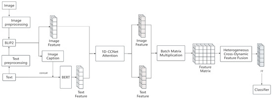 Although previous methods have demonstrated good performance, they typically handle different modalities separately, failing to fully utilize the correlation and complementarity between them. Additionally, these methods often use simple concatenation to fuse feature vectors from different modalities, which leads to excessive redundant information and reduces data utilization efficiency. To deal with these issues, this paper suggests a model framework based on the 1D-CCNet attention mechanism and a multimodal heterogeneous cross-fusion method. This method can fully utilize the correlation between different modalities and capture the spatial relationship between different positions in text at the word level and images at the pixel level to strengthen important parts of the modality. At the same time, it fully integrates the obtained features to avoid redundant information interference and achieve better performance.