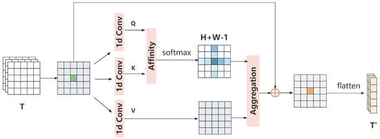 Next, a one-dimensional convolution layer with a kernel size of 1 is used to process H, and generate . For each position u, a set is obtained, where is the set of feature values within the identical column or row as the position u. The attention map A is aggregated with , as described by the following formula: