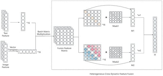 Equations (11)–(13) describe the process of fusing text features with image features. Here, denotes the text features vector, and denotes the image features vector. The mask matrix is used to obtain the main diagonal features, while is used to obtain the off-diagonal features. represents the final fused feature vector.