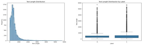 Text length distribution map (left) and comparison chart of different labels (right) of Gossipcop dataset. We conducted data visualization analysis on three datasets separately, but only the visualization results of the Gossipcop dataset are presented here.