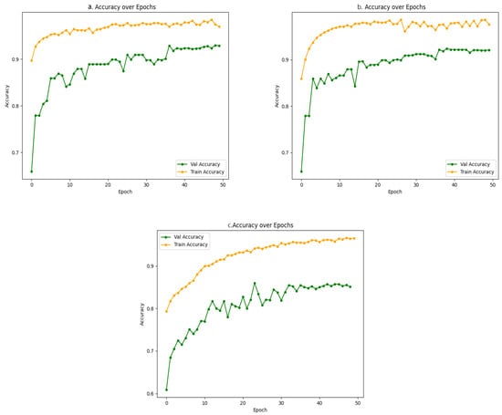 Figure 7 shows the accuracy curves for the proposed method’s training and validation on the three datasets, respectively. For the Twitter dataset, the BTCM model achieved accuracy of 0.984 and 0.925 on the training and validation samples, respectively. For the Weibo dataset, the BTCM model achieved accuracy of 0.985 and 0.909 on the training and validation samples, respectively. For the Gossipcop dataset, the BTCM model achieved accuracy of 0.966 and 0.857 on the training and validation samples.
