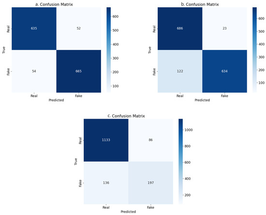 The confusion matrices for the Twitter (a), Weibo (b), and Gossipcop (c) datasets.