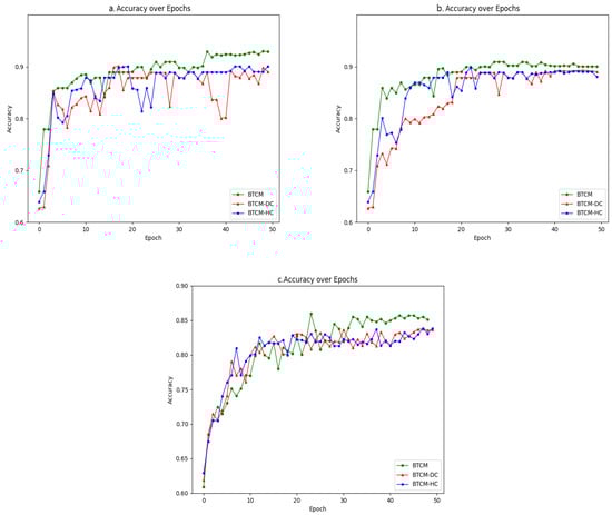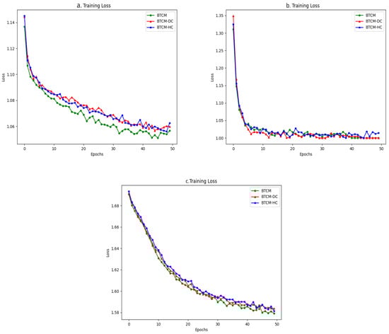 Figure 9 and Figure 10 show the accuracy and loss curves of the BTCM compared with the BTCM-DC and BTCM-HC models on the three datasets, respectively. As can be shown, the BTCM model’s accuracy is noticeably superior to the other two ablation models, and on the Twitter and Weibo datasets, the accuracy curve of the BTCM model fluctuates less, and the results in the middle and later stages are more stable. This indicates that the DCCA module for enhancing text feature extraction and the multimodal heterogeneous cross-fusion method proposed in this study improve the fake news detection model’s performance.