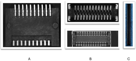 Example images of connectors. (A) Bottom view during the mounting process with detected leads’ coplanarity. (B) Bottom view of a connector with bent leads. (C) Side view of a right-angle connector with a defective pin.