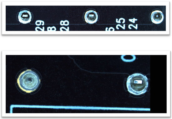 The system identifies corrosion and residues on metallic surfaces, aligning with the IPC-A-610 standards for cleanliness and surface appearance [19,21,26,28]. By detecting discoloration or corrosion, it ensures that components conform to the IPC-A-610 parameters for quality. Figure 5 showcases examples of components where corrosion and contamination have been successfully detected by the AI algorithm, illustrating the system’s capability to uphold stringent industry standards.