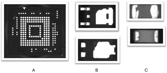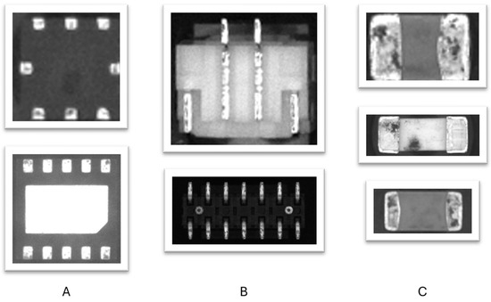 Various types of defects exist, including cracks [16,17], fractures, peeling metallization [18], deformations, discoloration, mold [19,20,21], and corrosion. Other frequent issues include bent or deformed leads and mis-shaped BGA balls. Standards like IPC-A-610H [18] and IPC-J-STD [22] outline these defect classifications for assembled PCBs, providing clear guidelines for defect identification. The top view of the PCB can also be analyzed using AI technology, as presented in [23,24,25]. While there have been significant advancements in the assembly and testing phases of electronics manufacturing, the inspection of electronic components themselves has often been overlooked. There is a common misconception that machines like pick-and-place and Automated Optical Inspection (AOI) machines assess the quality of components. In reality, these machines focus on the assembly process, only detecting deviations in component placement and identifying only major defects.