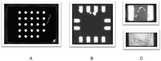 Bottom-view images of component with oxidation/contamination/corrosion on the soldering leads. Images taken from the bottom side during pick-and-place process. (A) Bottom Termination Component (BTC) with contamination on the soldering terminations. (B) Connectors with corrosion on the soldering leads. (C) Passive components with corrosion and burn marks on the terminations.