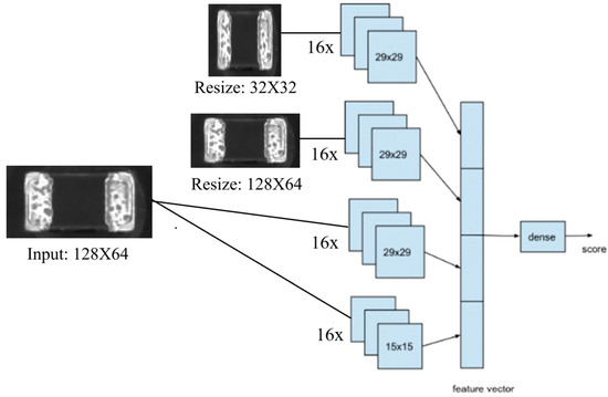 The subtle nature of some defects and corrosion, such as minor dots or faint discolorations, complicates their detection. Traditional Convolutional Neural Network models often struggle with these inconspicuous defects due to their limited ability to capture fine-grained details. To overcome these challenges, we developed a specialized network architecture tailored for defect and corrosion detection as detailed in [14,26] (see Figure 9). This architecture deviates from the typical serial structure of common image classification models, which sequentially connect layers of small 3 × 3 filters. Instead, the model uses a parallel configuration of filters of varying window sizes, each designed to detect specific types of defects or corrosion within component images. These filters generate features indicative of defects, which are then concatenated into a comprehensive feature vector. This vector passes through a dense layer to yield the final defect and corrosion score.